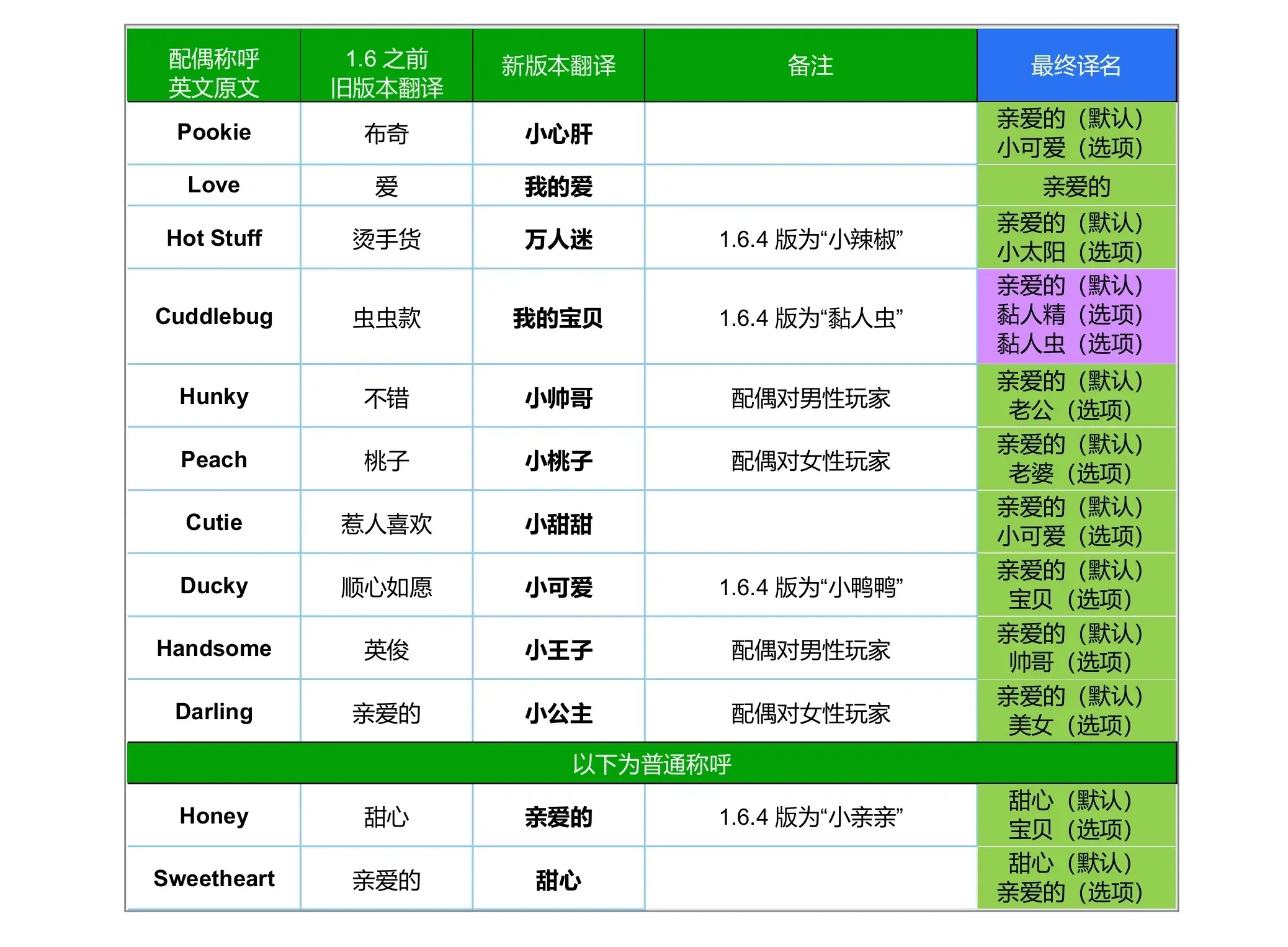 贴吧中文修订 MOD 相关文档4.1 改动说明本页总览4.1 改动具体说明 显著改动 细微改动 爱称相关 因爱称相关内容相对特殊,每个人的喜好看法都不一样,且特殊爱称相关在游戏内本身就是概率触发的彩蛋内容,所以我们在特殊爱称的处理上采用了与其他修订内容不同的方式,我们设计成了模式切换,当未启用时,特殊爱称相关内容将统一显示为“亲爱的”,当选中时,则会出现修订后的内容,可根据自身喜好自由选择。