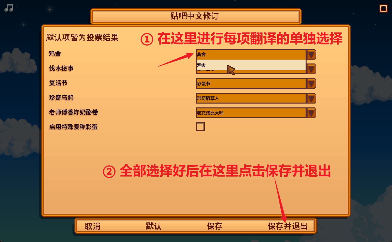 3. 进入贴吧中文修订的配置 菜单后,你可以在这里看到所有可供选择的翻译项,目前默认项为投票结果最高票内容,其余选项为票数相近的,可根据自身喜好在这里进行自由选择,选择好后保存并退出即可生效。
